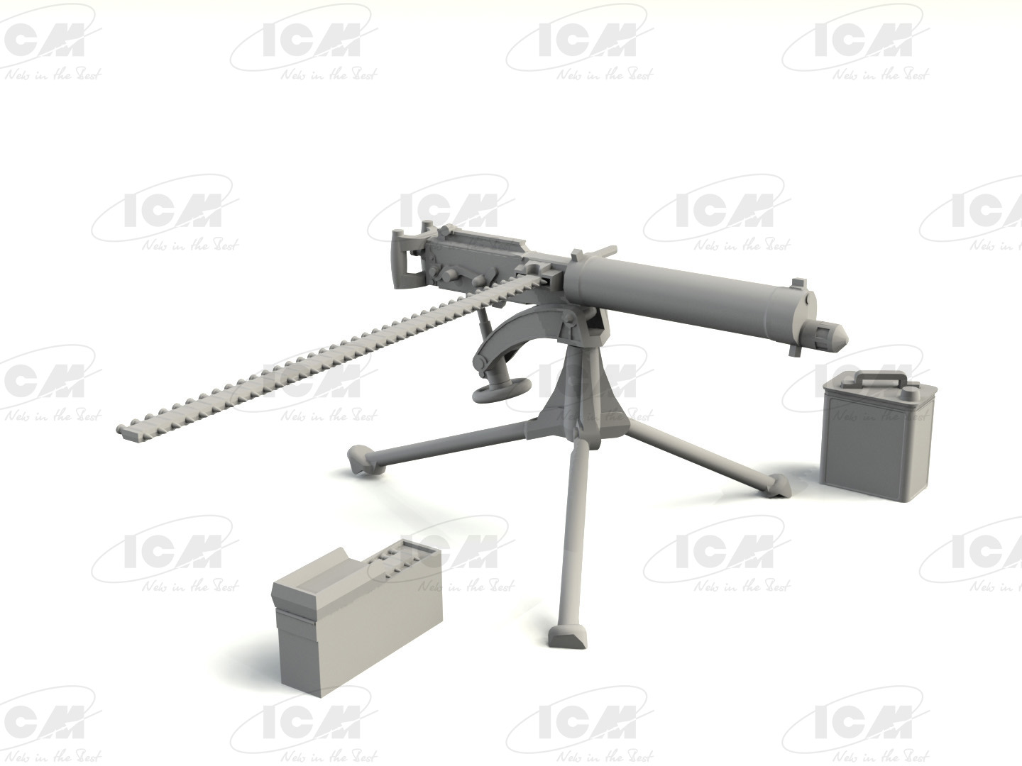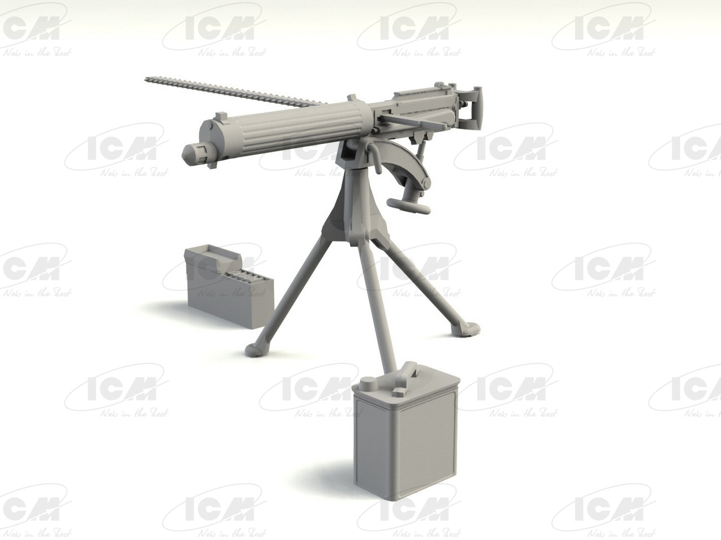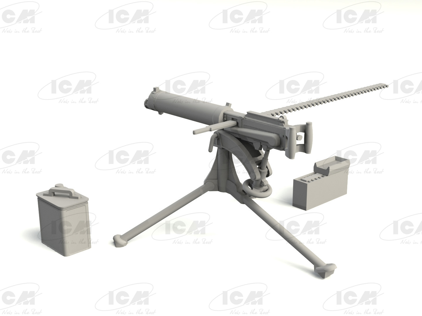 В набор входят 44 детали для сборки пулемета MG08, гильзы, пояса боеприпасов и резервуары для воды.