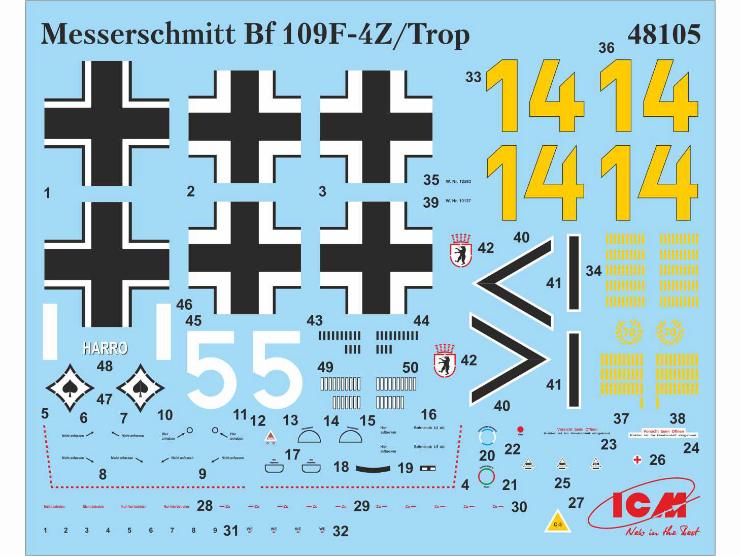 С марта 1941 г. производились истребители Bf 109F2, кофторые были вооружены 15мм пушкой MG 151/15. В июне 1941 г. на вооружение была принята модификация Bf 109F4 с 20мм MG 151/20, усиленным бронированием и другими усовершенствованиями. На самолетах модификации Bf 109F4z/Trop, производившихся с августа 1941 г., устанавливались противопыльные фильтры, а также система повышения мощности двигателя GM 1.